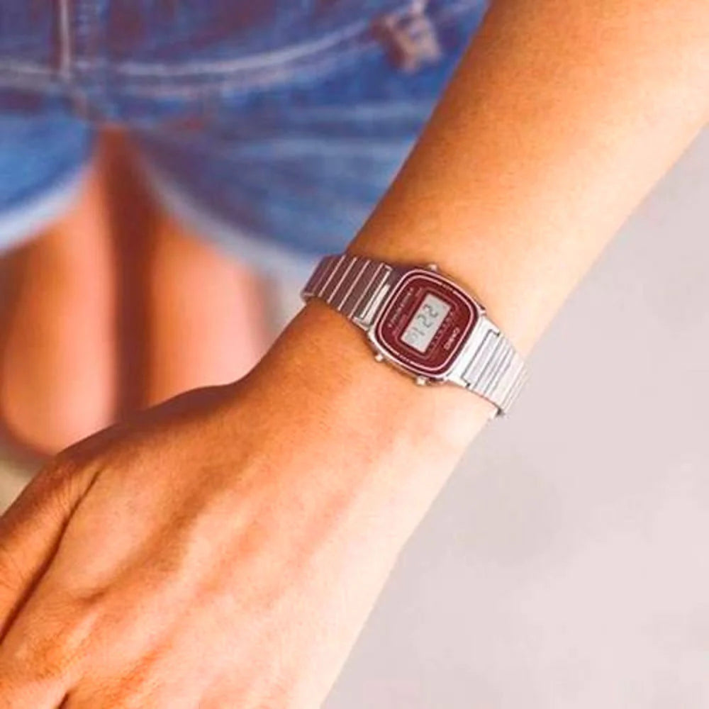 En un elegante tono plateado, este modelo Casio LA670WA-4DF nos convence de que el reloj perfecto depende de cada persona. Además, sabemos que desde los años 20 hasta los 50 del siglo pasado grandes estrellas del cine como James Stewart usaban relojes de pulsera de tamaños más pequeños, que con el paso del tiempo fueron siendo catalogados como femeninos. ¿Por qué razón no considerarlo unisex? Date un pequeño gusto y entrégate a lo retro sin prejuicios!